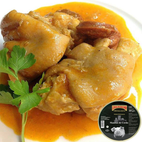Ingredientes: Manitas de cerdo, cebolla, ajo, tomate, aceite de oliva y sal.